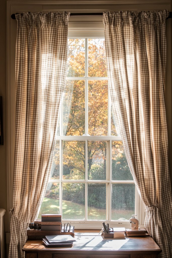 Want to soften your workspace and control natural light? Linen curtains with classic gingham or plaid patterns bring a cozy, farmhouse vibe that’s both functional and charming. They add texture and color without overwhelming the space. Plus, they’re easy to switch out seasonally.