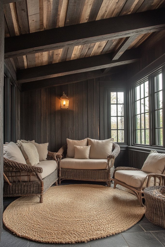 Imagine walking into a sunroom where rough-hewn wooden beams stretch across the ceiling, their natural grain catching the soft light. Reclaimed wood paneling lines the walls, adding texture and character. The imperfect knots and faded paint tell stories of years gone by, blending history with comfort. The overall effect is a space that feels grounded, warm, and inviting.
