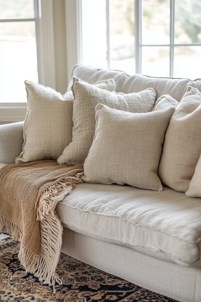 Select pillows with removable, washable covers in natural fabrics like linen, burlap, or cotton. Arrange them in a balanced way to complement your seating. Add throws in matching or contrasting textures to enhance the layered effect. Use decorative elements like tassels or braided trims for extra detail. Wash covers regularly to maintain freshness and appearance. Mix and match to keep the look dynamic.