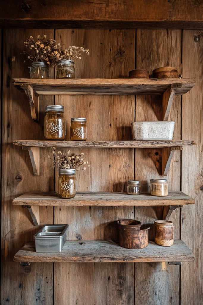 Build or buy open shelving in reclaimed wood, metal, or a combination. Mount securely to wall studs, ensuring the weight capacity matches your storage needs. Arrange jars with labels facing outward for easy identification. Use chalkboard labels for versatility. Keep the shelves clean and organized, rotating items seasonally for freshness. Regular dusting preserves the rustic charm.