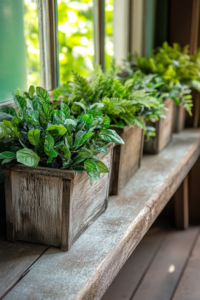 Want lush greenery without the hassle of watering or sunlight? Weathered wooden planters filled with faux plants are your best friends. They add vibrant color and texture while requiring minimal upkeep. Plus, they blend perfectly with farmhouse decor, giving your sunroom a fresh, lively feel.