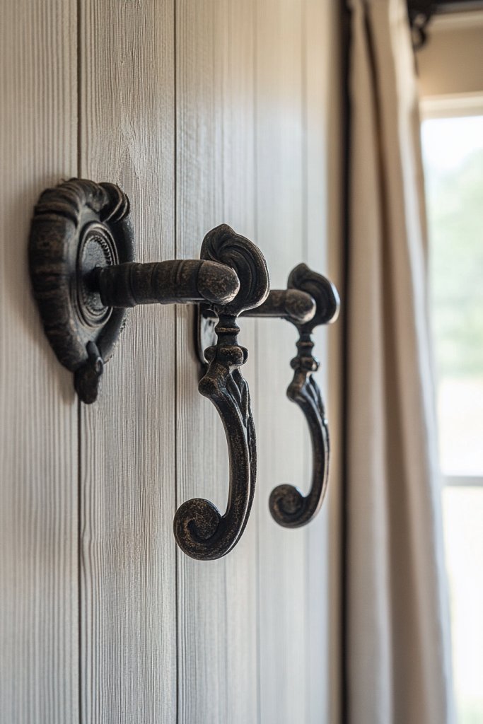 Choose from different finishes—antique, matte, or gloss—to match your overall aesthetic. Incorporate decorative hardware like drawer pulls, cabinet handles, or wall hooks. Use ornate iron designs for a vintage look or simple, sleek pieces for a more modern farmhouse vibe. Mix and match for a layered, curated appearance.