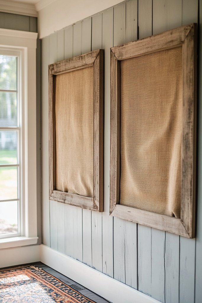 Visualize a wall adorned with large framed panels of natural linen and burlap, their textured surfaces catching the light softly. The frames, either distressed wood or painted in muted tones, complement the fabric’s earthy appeal. These panels create a layered, sophisticated backdrop that enhances other rustic elements. They’re versatile enough to serve as focal points or subtle accents.