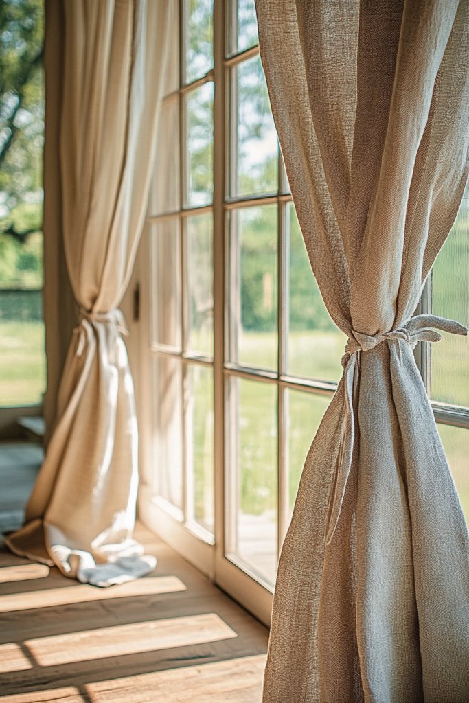 Picture flowing linen curtains in a soft neutral hue hanging from simple wooden rods, billowing gently with the breeze. The fabric’s natural texture adds a relaxed, airy feel, perfect for farmhouse charm. When tied back, they reveal the view and let in sunlight. When open, they create a layered, textured backdrop that enhances the room’s cozy vibe.
