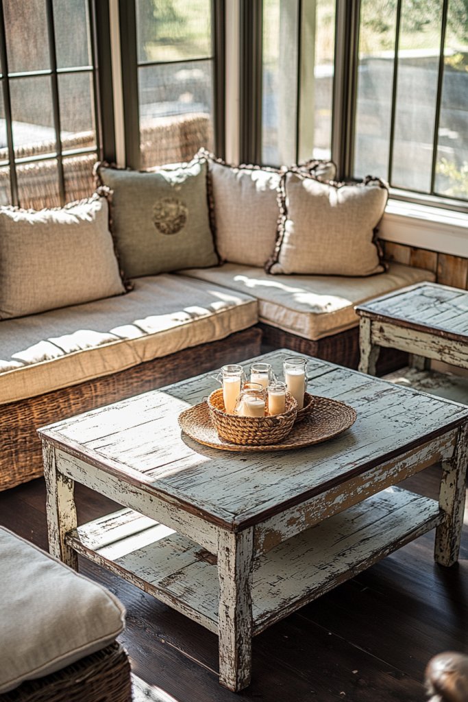 Who doesn’t want a coffee table that looks like it’s been part of the family for decades? Distressed wooden tables bring instant charm and character to your farmhouse sunroom. They’re practical, stylish, and effortlessly create that lived-in, cozy vibe everyone loves. Plus, they’re surprisingly easy to find or make yourself.