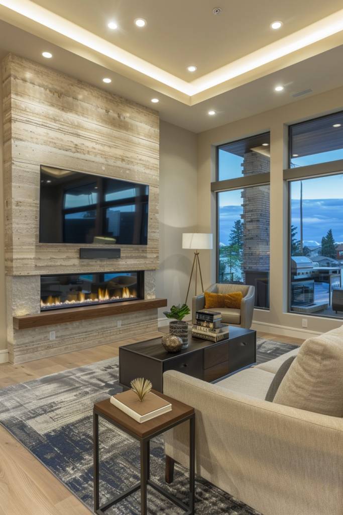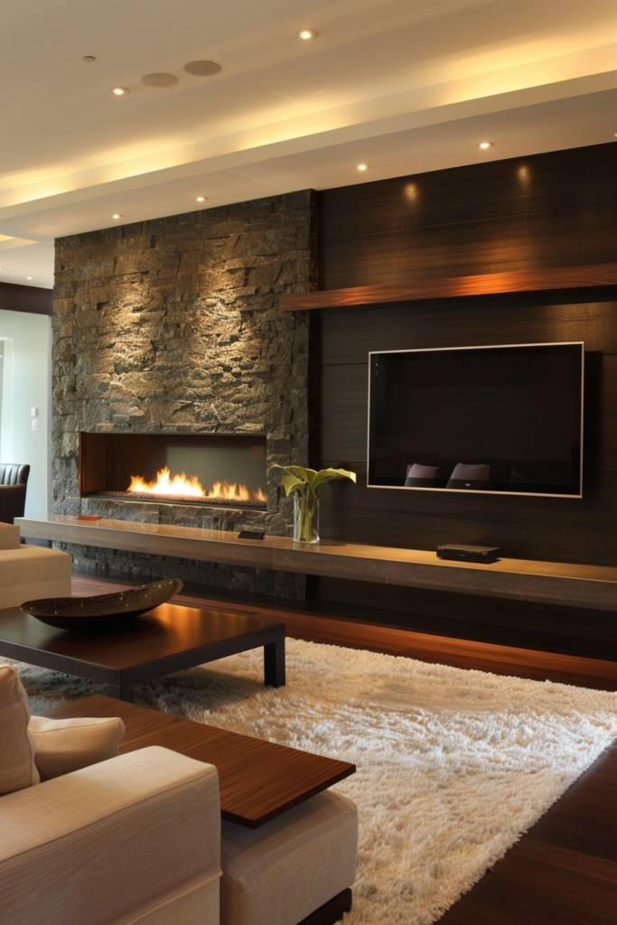 To enhance this design, consider the placement of the TV; it should be at eye level for ideal viewing while allowing the fireplace to shine. You can incorporate a wood beam mantel that ties the two elements together, adding texture and warmth.