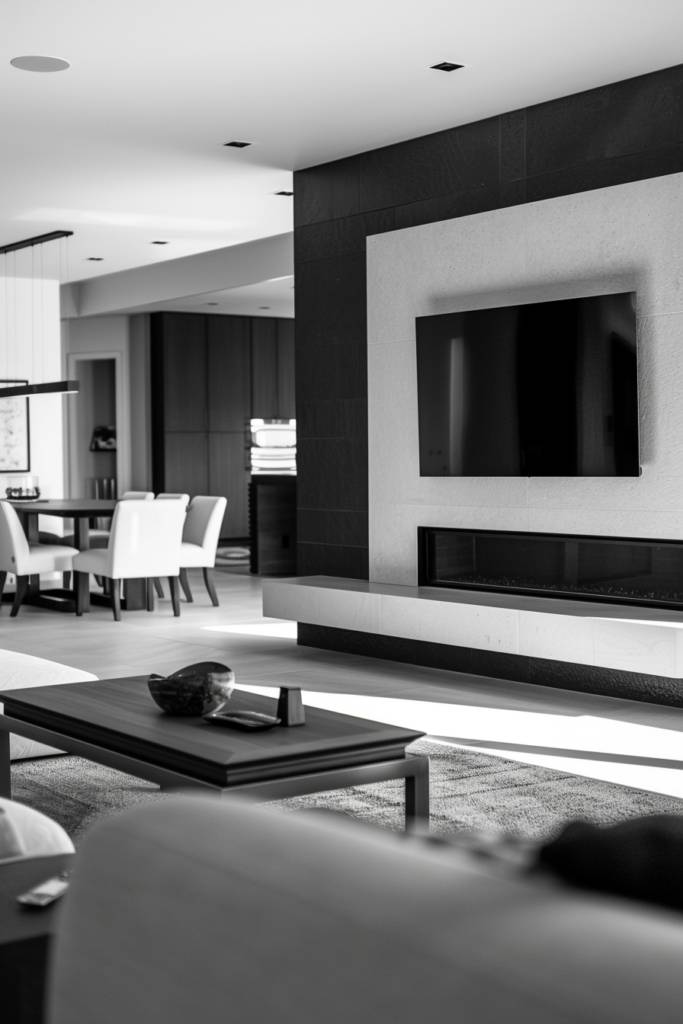 Bold black and white design offers a striking visual contrast that can transform your fireplace TV wall into a stunning centerpiece. Imagine a sleek, matte black fireplace flanked by crisp white cabinetry, creating a balanced aesthetic that draws the eye. You can enhance the drama by incorporating geometric patterns or bold artwork in black and white, adding depth and personality to your space.