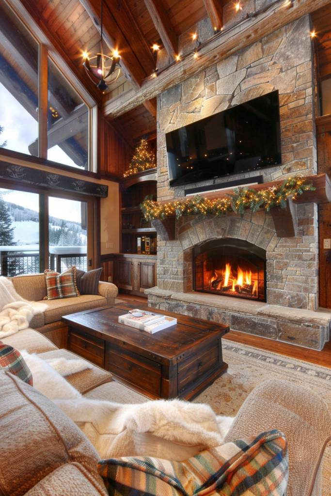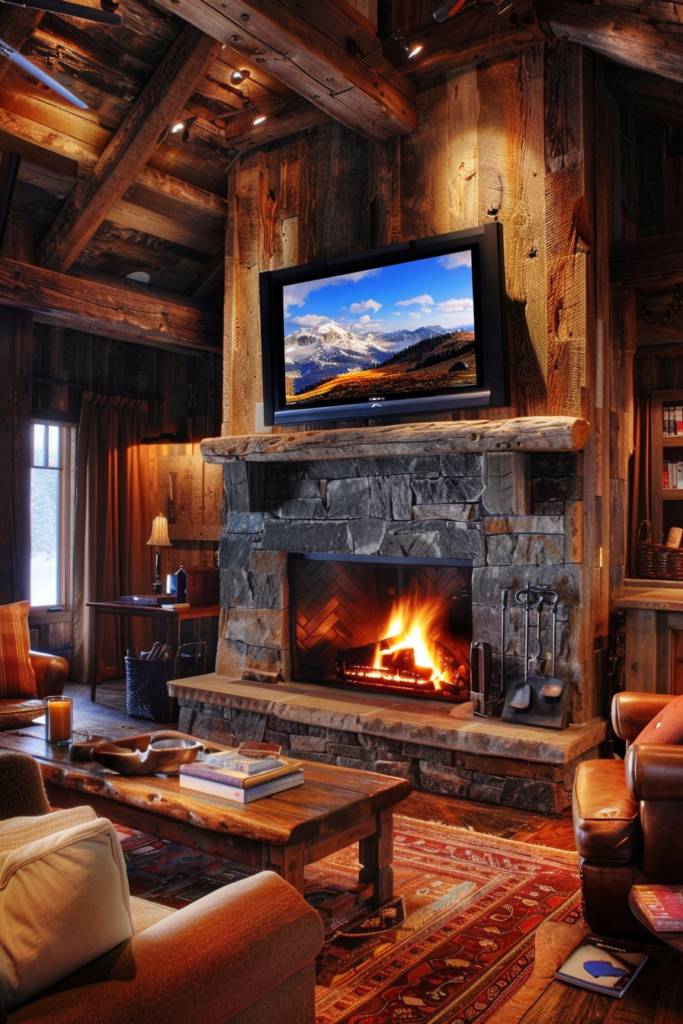 A rustic stone fireplace paired with a wall-mounted TV creates an enchanting blend of natural charm and modern convenience. Imagine the warm, earthy tones of the stone juxtaposed against the sleek, contemporary lines of your television. This combination not only serves as a focal point in your living space but also invites a cozy ambiance, perfect for family nights or entertaining friends.