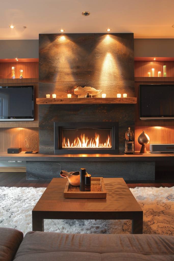 Incorporate subtle lighting to highlight the fireplace’s elegance and create a cozy ambiance. Consider a neutral color palette, where soft whites and grays evoke tranquility.