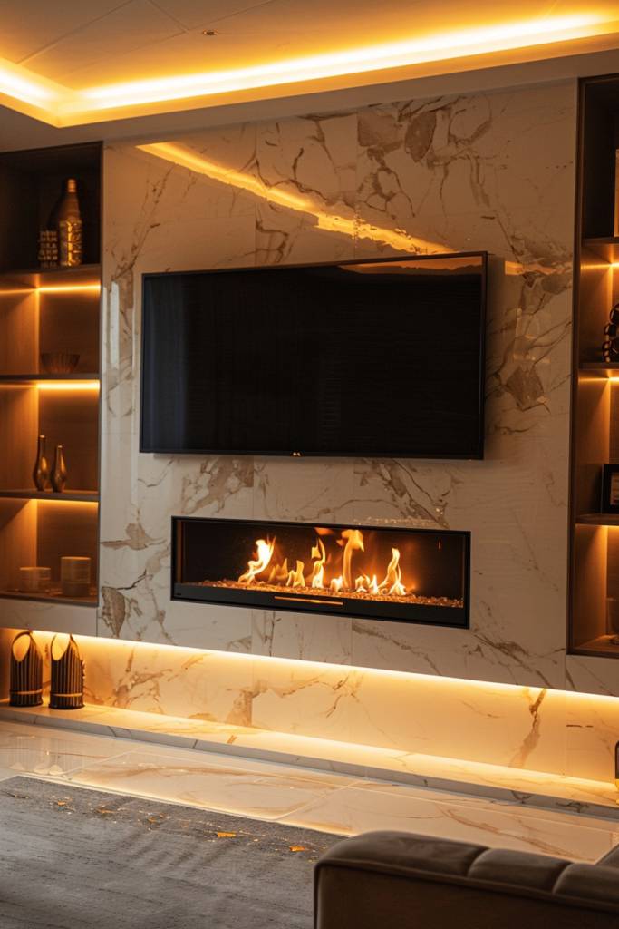 Imagine a living space where elegance meets warmth, perfectly embodied by a glamorous gold and marble finish. This striking combination elevates your fireplace TV wall into a statement piece that radiates sophistication. The smooth, white marble serves as a stunning backdrop, its natural veining adding character and depth. Pair it with gold accents—think sleek frames, chic candle holders, or an opulent mirror—and watch how they catch the light, infusing the room with a warm glow.