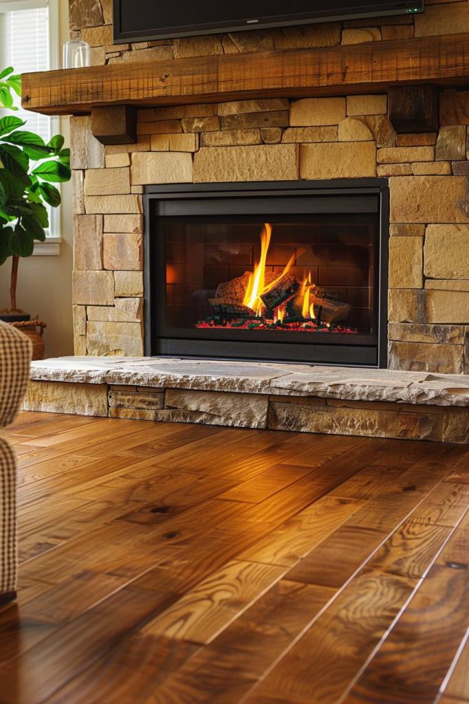 Don’t shy away from accentuating the rustic theme with complementary décor—think vintage lanterns or woven baskets. This stylish setup transforms your room into a welcoming retreat, where you can enjoy the flickering flames while catching up on your favorite shows.
