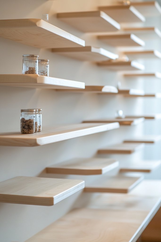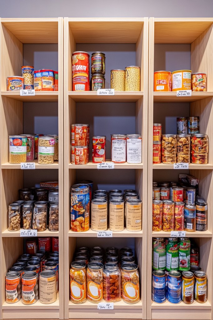 Imagine sleek, open shelves stretching across a well-lit wall, filled with neatly stacked cans, jars, and boxes. The shelves are made of warm wood or matte metal, giving a modern yet cozy vibe. Items are arranged in a way that’s both accessible and visually appealing, with labels facing outward for quick identification. The space feels airy, organized, and inviting, almost like a boutique pantry.