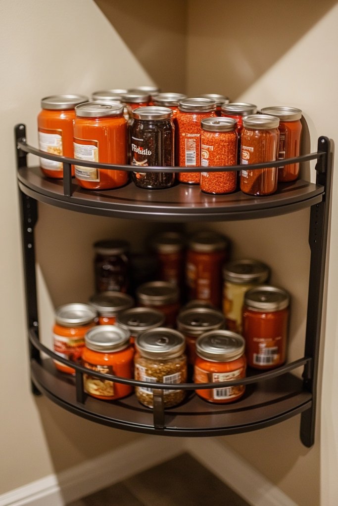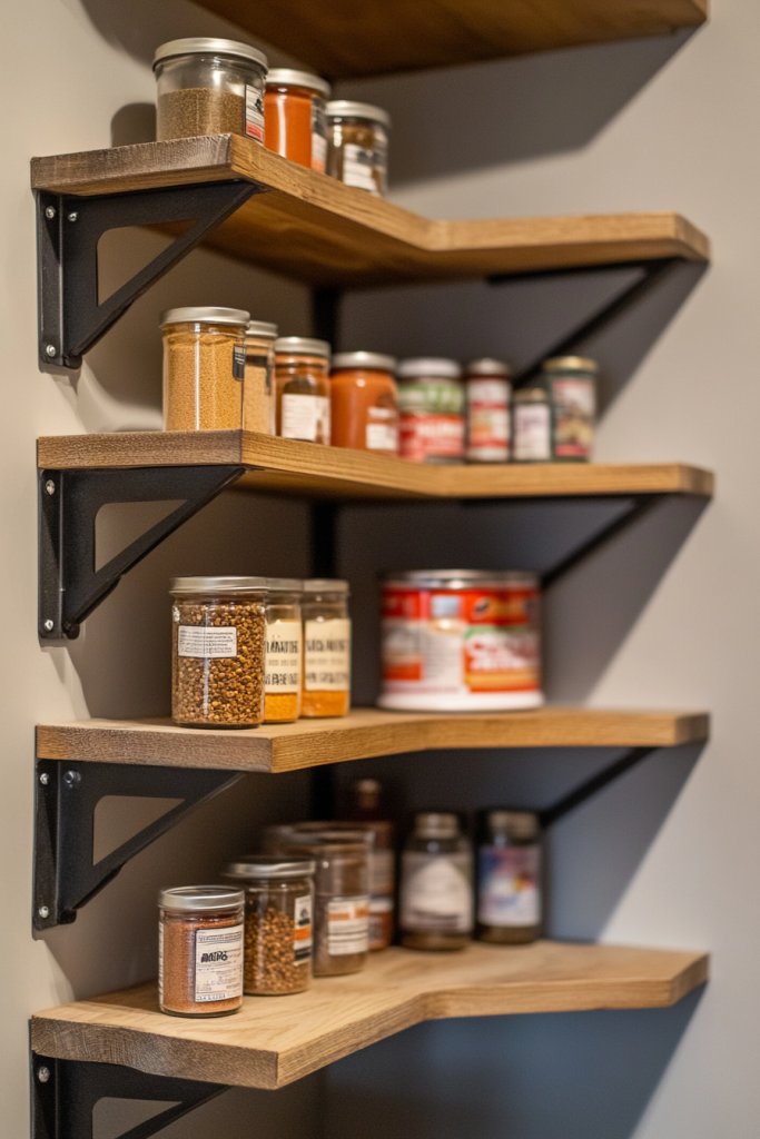 Visualize a sleek, triangular or L-shaped shelf snug in the corner of your pantry, filled with neatly organized jars and cans. The shelves are made of wood, metal, or plastic, depending on your style, and are supported with brackets or mounted directly to the wall. The arrangement makes the most of every corner, creating a tidy, purposeful look that complements your overall decor.