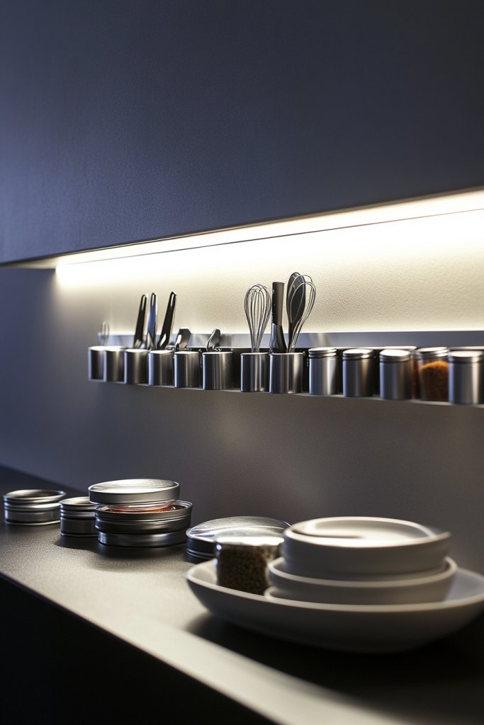 Imagine a sturdy magnetic strip mounted on a wall or inside a cabinet door, holding metal measuring spoons, spice tins, or small utensils. The items stick firmly yet are easy to remove when needed. The strip itself is minimalist, blending seamlessly into your storage space, while the organized display adds a modern, functional touch.
