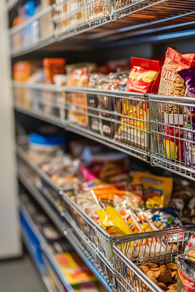 Imagine wire or plastic baskets hanging beneath your existing shelves, filled with colorful snack packs or spice packets. They slide in easily and stay put, creating a layered look that’s both organized and accessible. The baskets are lightweight but sturdy, with handles or hooks for quick removal. Everything is within easy reach, yet neatly tucked away.