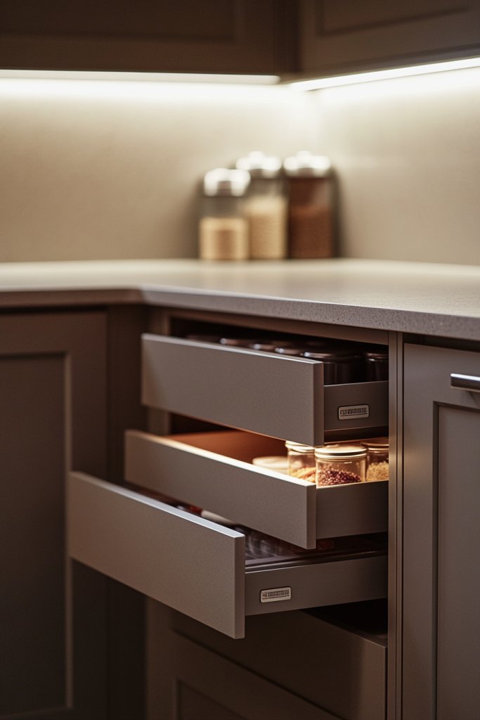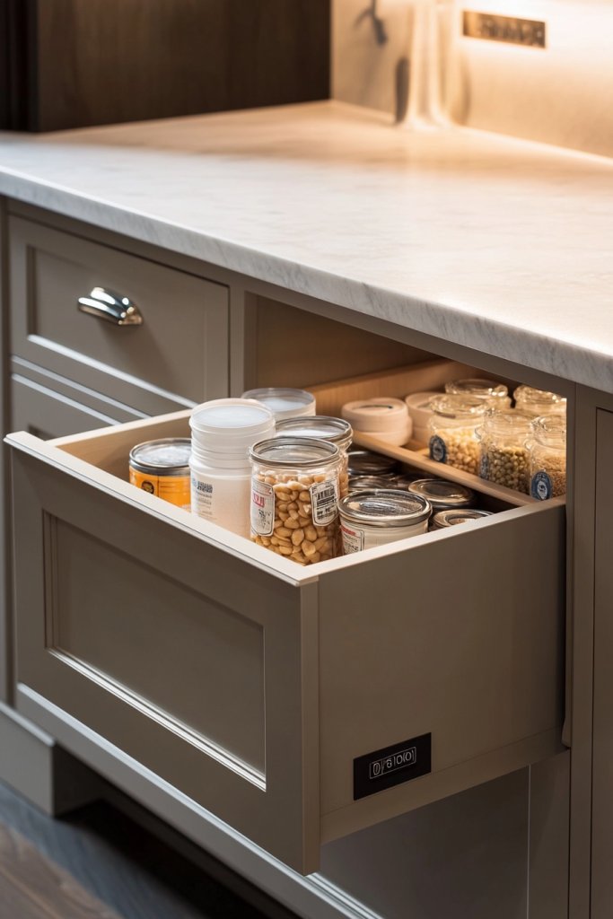 Imagine deep drawers tucked into your cabinetry, smoothly sliding out to reveal neatly organized rows of jars, boxes, or spice tins. The drawer fronts are flush with your cabinets, giving a seamless appearance. Inside, dividers and small containers keep everything separated and easy to find. When closed, they’re invisible, maintaining a tidy, minimalist aesthetic.
