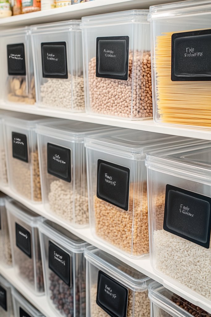 Picture uniform transparent bins stacked neatly on shelves, each with bright, easy-to-read labels like ‘Grains,’ ‘Snacks,’ or ‘Canned Goods.’ The clear plastic allows you to see what’s inside without opening each container, saving time and hassle. The labels are colorful and appealing, adding a pop of order amidst the chaos. Everything looks tidy, inviting, and just plain logical.