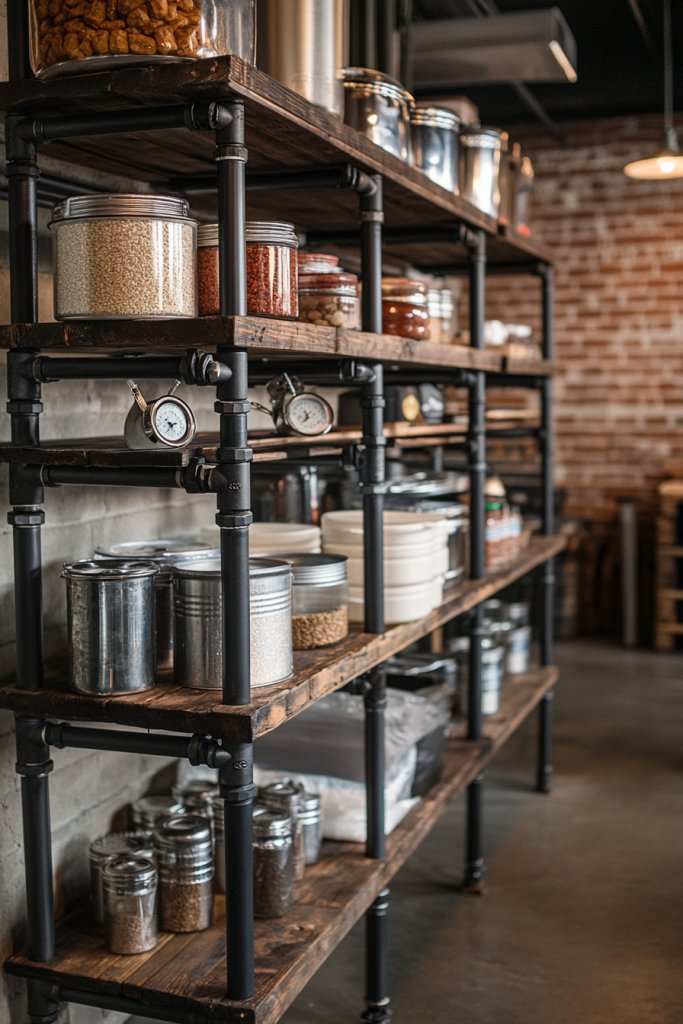 Envision thick black metal pipes supporting reclaimed wood planks filled with jars, cans, and boxes. The pipes are exposed, crossing the wall in geometric patterns, giving an edgy yet functional vibe. The wood shelves are finished with a matte sealant, highlighting their natural grain. This setup turns your storage into a statement piece that’s both practical and eye-catching.