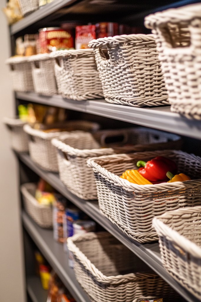Imagine a series of woven or plastic baskets stacked neatly on top of each other, each labeled for different food groups. The baskets come in various sizes, fitting into tight corners or deep shelves. Their textures add visual interest, from smooth plastic to rustic wicker, creating a cozy, organized vibe. Everything looks accessible and inviting.