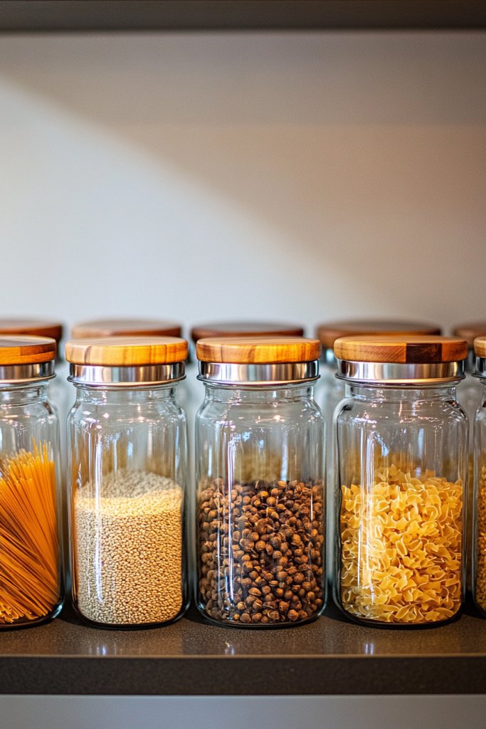 Visualize uniformly sized glass jars lined up on open shelves or inside cabinets, filled with rice, pasta, or spices. The transparency allows you to see at a glance what’s inside, while the uniformity creates a sleek, cohesive look. Metal or wooden lids add a touch of sophistication, and labels or tags add personality.
