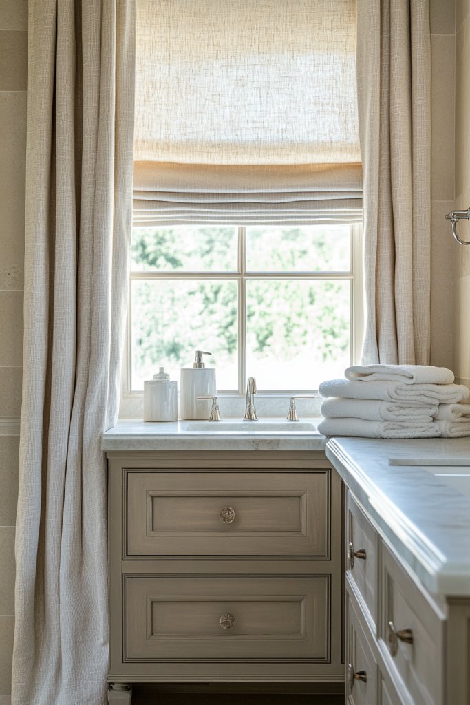 Want a bathroom that feels light, airy, and effortlessly elegant? Linen curtains or Roman shades in neutral tones are your best friends. They add softness and privacy without overwhelming the rustic charm. Plus, they’re super versatile—perfect for updating your space seasonally or as your style evolves.