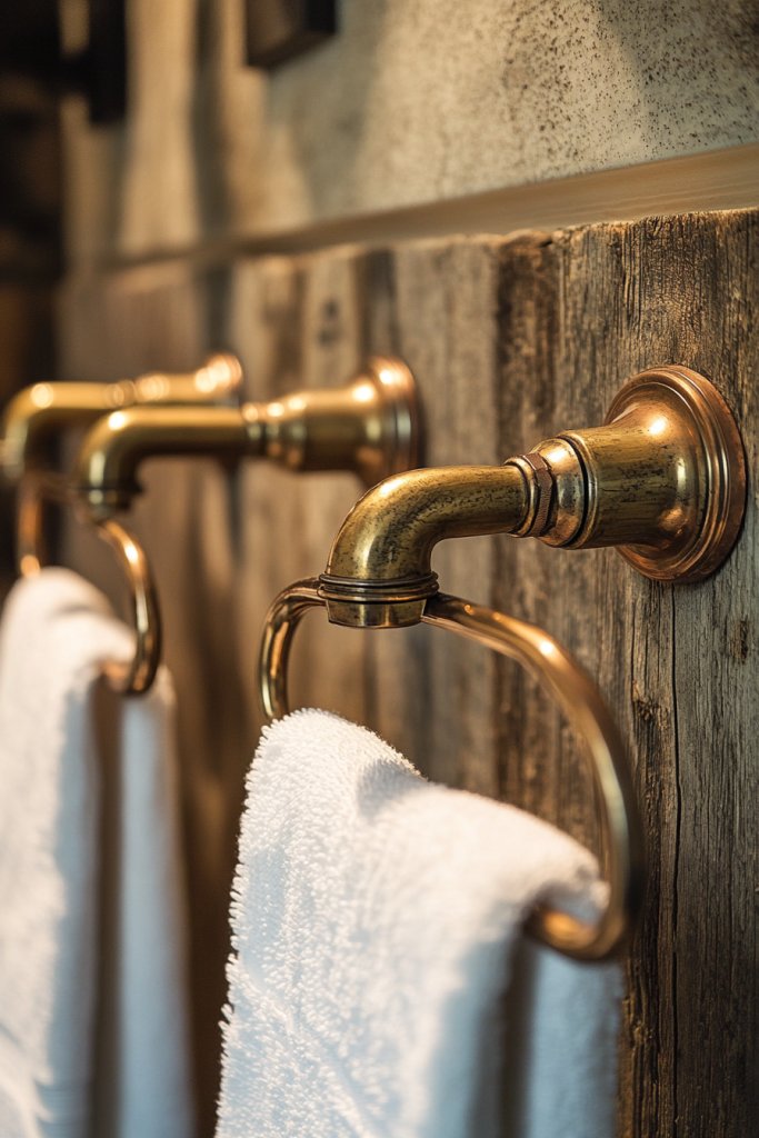 Visualize aged brass faucets with a warm, matte finish, complemented by matching towel bars and hooks. Copper fixtures with a patina develop a rich, antique look that pairs beautifully with textured walls and distressed surfaces. The warm metallic sheen reflects soft light, adding depth and a touch of glamour to rustic surroundings. It’s a perfect blend of functionality and vintage flair.