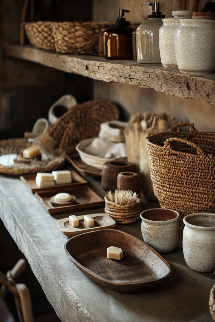 Picture wooden trays with a weathered finish, ceramic jars with textured surfaces, and woven baskets filled with essentials. These natural elements add tactile richness and visual warmth, complementing distressed surfaces and vintage fixtures. The combination evokes a sense of craftsmanship and authenticity, turning your bathroom into a rustic retreat full of textured layers.