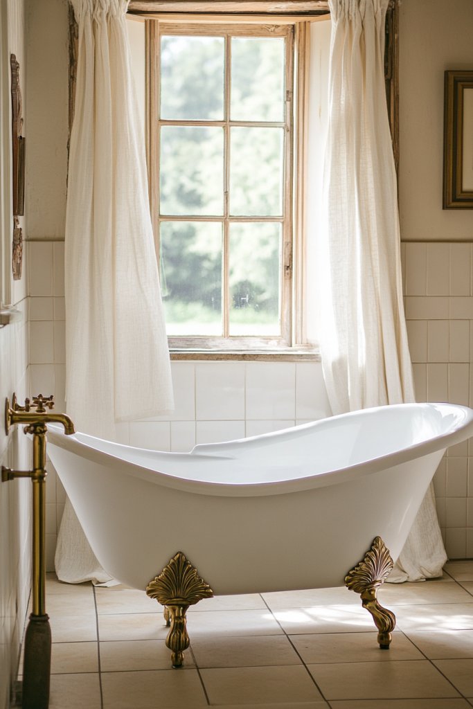 Visualize a pristine white clawfoot tub with ornate, curved legs and a deep, inviting basin. The gleam of enamel reflects soft light, creating a focal point that exudes elegance. Surround it with textured rugs and antique fixtures to complete the look. The overall vibe is timeless, romantic, and just a little indulgent—a perfect centerpiece for a French country bathroom.