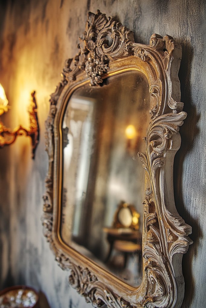 Imagine a large mirror framed with intricately carved wood or distressed metal, with flourishes that echo French vintage design. The frame’s patina adds character, giving an aged yet refined look. The mirror’s glass is clear and crisp, bouncing light around the room. When illuminated by sconces or natural light, it creates a warm, inviting glow that enhances the entire space.
