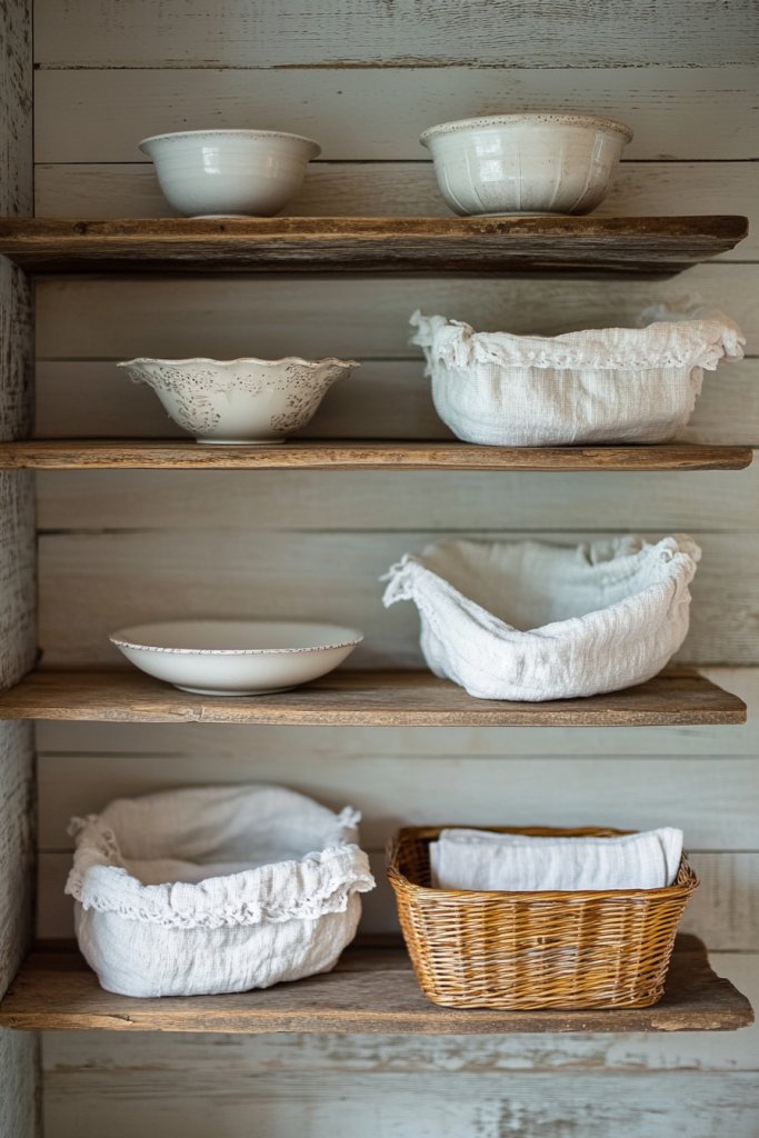 Begin by installing sturdy wooden or painted shelves at appropriate heights. Use brackets with vintage or wrought iron detailing. Decorate with vintage-inspired crockery like ceramic pitchers or vintage jars, which can double as storage containers. Place linen baskets underneath or on the sides for added organization. Keep everything accessible but visually appealing, balancing practicality with charm. Regular dusting and gentle cleaning will maintain the rustic feel.