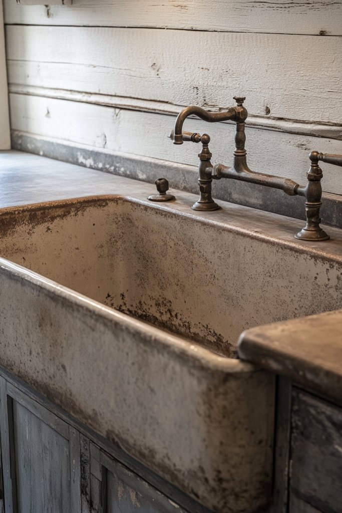Choose a sink with a distressed or matte finish for an aged look, or go for a cleaner, polished surface for a slightly more refined style. Pair it with vintage or matte black fixtures for contrast. For smaller bathrooms, opt for a compact version with similar apron details. Decorate around it with textured towels, antique accessories, or distressed wood accents—no vases or plant greenery necessary.