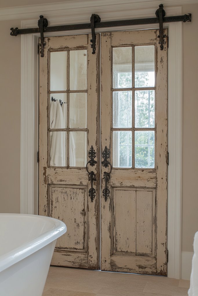 Use antique doors as a decorative feature on a blank wall or as a divider between spaces. Shutters can be mounted on walls or left open to reveal windows. For smaller bathrooms, opt for shutters that can be easily painted or distressed to match your decor. Incorporate vintage hardware or iron accents for extra authenticity.