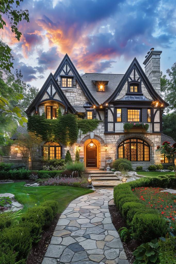 Adding a prominent front door with ornate carvings and a spacious arched entryway invites guests with elegance. You might also explore using rich, warm colors for your exterior finishes to complement the traditional aesthetics. Incorporating stone accents or an elaborate chimney can further enhance the luxurious feel. By blending these features, you’ll create a stunning façade that stands out while paying homage to the timeless Tudor legacy.