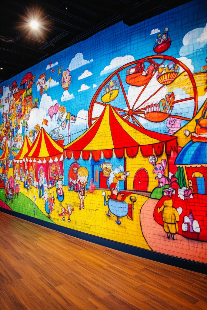 Imagine a vibrant scene with colorful tents, Ferris wheels, and playful game booths. Bright stripes, cheerful characters, and festive banners fill the wall with energy. Use bold, saturated colors—reds, yellows, blues—to emulate a lively fairground. Light, airy clouds and twinkling stars add a magical touch.