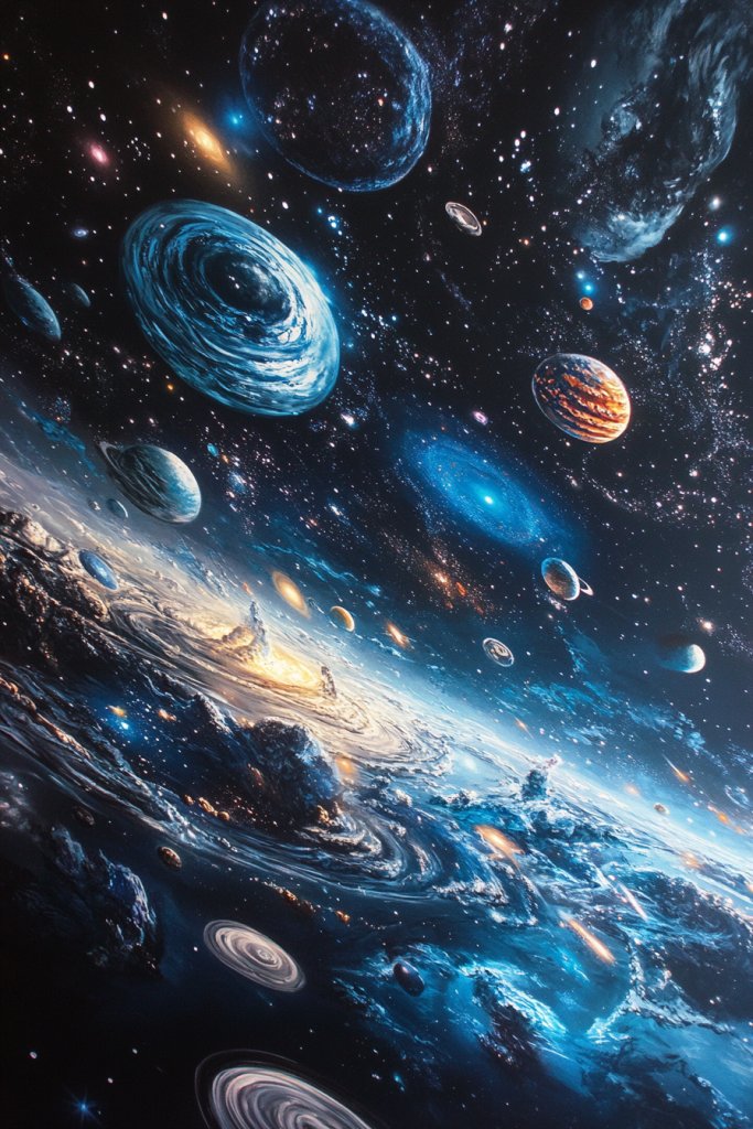 Imagine swirling nebulas, glittering stars, and distant planets painted in vibrant blues, purples, and golds. Rockets, satellites, and alien landscapes add excitement and depth. Use splatter techniques to mimic star fields and layered brushstrokes for celestial bodies. The scene feels vast and mysterious, inviting exploration.