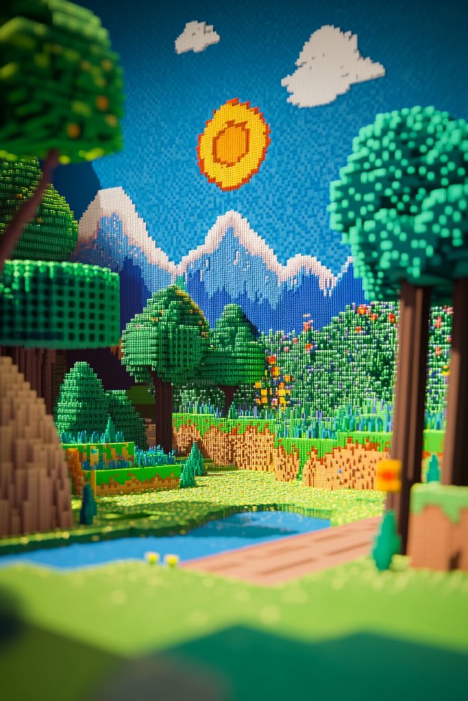 Imagine pixelated trees, mountains, rivers, and animals in a simplified, blocky style. Bright greens, blues, and browns create a cheerful, inviting landscape. Use pixel art techniques to build layers of scenery, giving depth and perspective. The scene feels like a classic video game level, full of adventure.