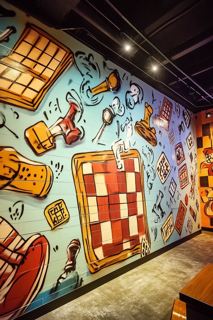Ever wish your game room had a more interactive vibe? A mural inspired by classic board games like chess, checkers, or Scrabble turns the wall into an engaging, playable piece of art. It combines nostalgia with a touch of strategy, making the space feel alive. Who says walls can’t be fun?