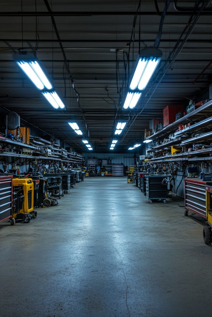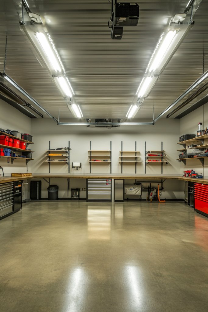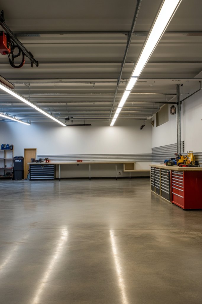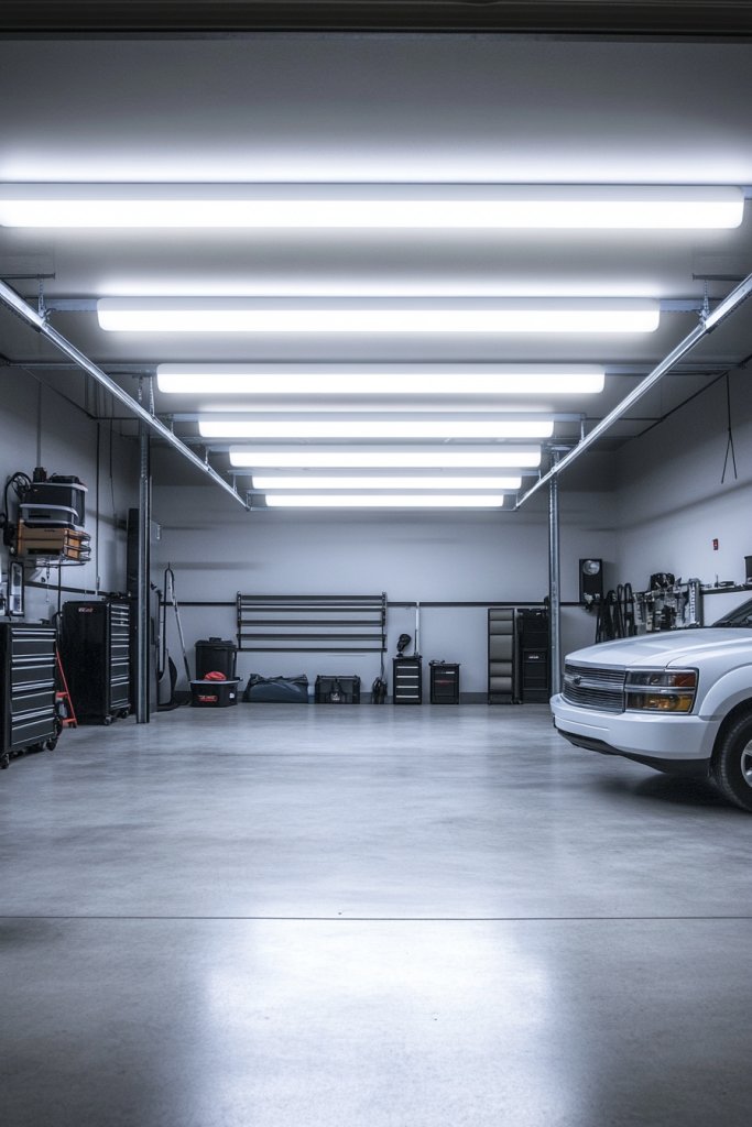 Visualize long, tubular fluorescent fixtures suspended from the ceiling, their diffusers softening the harsh light. The light spreads uniformly across workbenches, floors, and storage areas, minimizing shadows. The white glow highlights every detail, making your projects easier and safer. The fixtures are simple, functional, and blend into most garage styles without drawing attention.