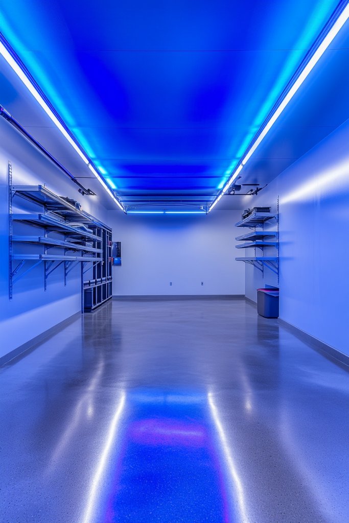 Imagine a ceiling lined with sleek, continuous strips of LED lights emitting a crisp, white glow. The light is evenly distributed, washing the entire garage in a soft, glare-free radiance. Sharp shadows disappear, revealing every nook and cranny. The uniform illumination makes it easier to spot tools, parts, or that tiny screw you dropped last week. It’s like turning on a giant, energy-efficient sun right above your head.