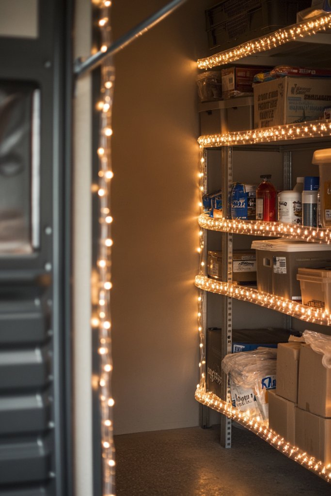 Imagine a string of durable, weather-resistant bulbs draped along the ceiling edges or around door frames. The warm glow casts a gentle, ambient light that flickers softly, reminiscent of a backyard patio. The string lights add visual interest and depth, framing your space with a subtle, decorative glow. They’re perfect for evening hangouts or casual gatherings, transforming the garage into a little social oasis.