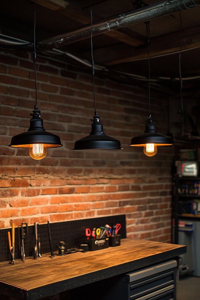 Picture a set of rugged, metal pendant fixtures hanging above your workbench. The warm glow from filament-style bulbs casts a cozy yet gritty ambiance. You see the contrast between the raw metal finish and the soft, warm light illuminating your projects. The pendants sway slightly with movement, adding a dynamic, industrial charm. It’s like working in a hip warehouse, but with all the tools within arm’s reach.