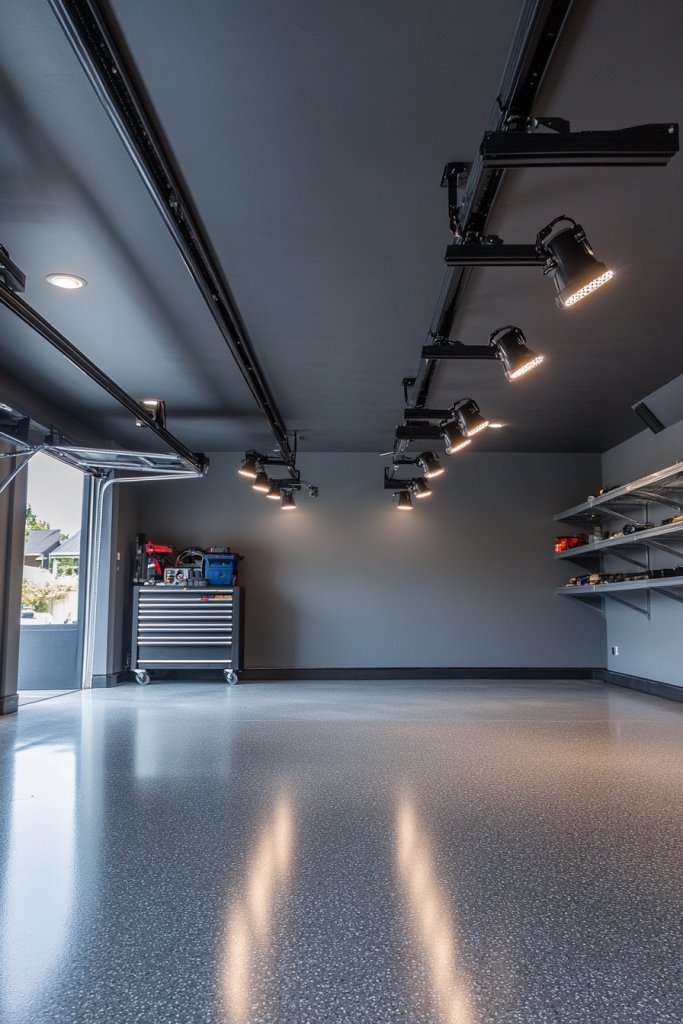 Ever wish you could direct your garage lighting exactly where it’s needed? Track lighting offers that flexibility, letting you customize illumination for different projects or moods. It’s perfect for garages that serve multiple purposes, from car repairs to hobby workshops. No more fixed fixtures dictating your lighting; now you’re in control.