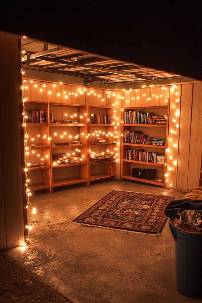 Looking to add warmth and charm to your garage? String lights along the perimeter create a cozy, inviting atmosphere perfect for relaxing or socializing. They soften the harshness of typical garage lighting and turn an often utilitarian space into a welcoming retreat. Who says garages can’t be charming?