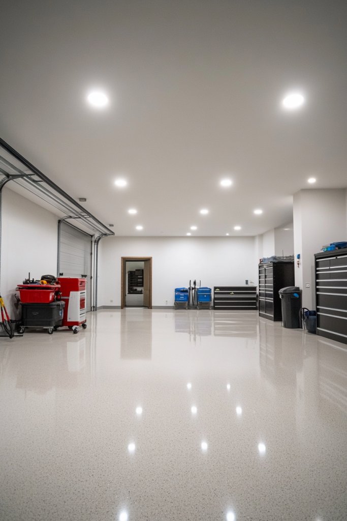 Visualize a row of flush-mounted lights embedded into the ceiling, their trim barely visible. The light radiates evenly across the space, eliminating shadows and dark corners. The clean lines and unobtrusive design create an open, airy feel. When turned on, the uniform brightness highlights your storage and work areas, making everything pop with clarity. It’s like illuminating a high-end showroom or modern office.