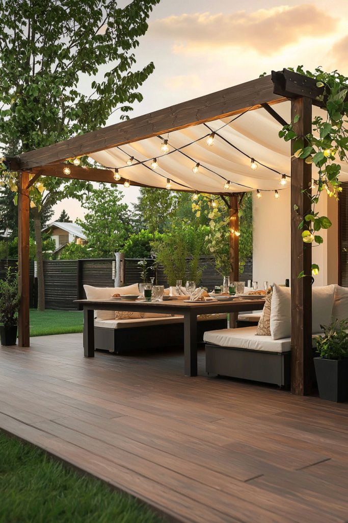 To elevate the romance, consider fragrant flowers or soft music playing in the background. This dreamy gazebo isn’t just a structure; it becomes a cherished retreat where memories are made, laughter lingers, and love blossoms. With twinkling lights, your backyard transforms into a haven of romance and tranquility.
