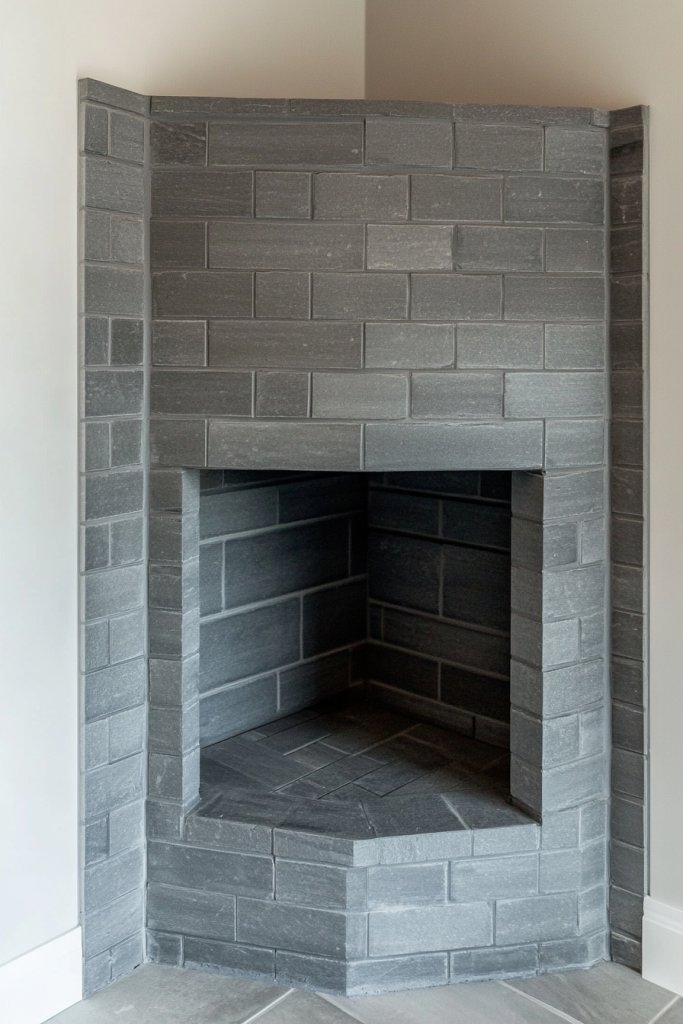 Imagine a corner where gray bricks wrap around two walls, forming a sleek, angular fireplace that fits snugly into the corner. The textured bricks add depth, while a simple hearth or raised platform completes the look. Soft lighting emphasizes the enclosure, making the corner feel intimate and inviting. It’s a space-saving design that doesn’t skimp on style.