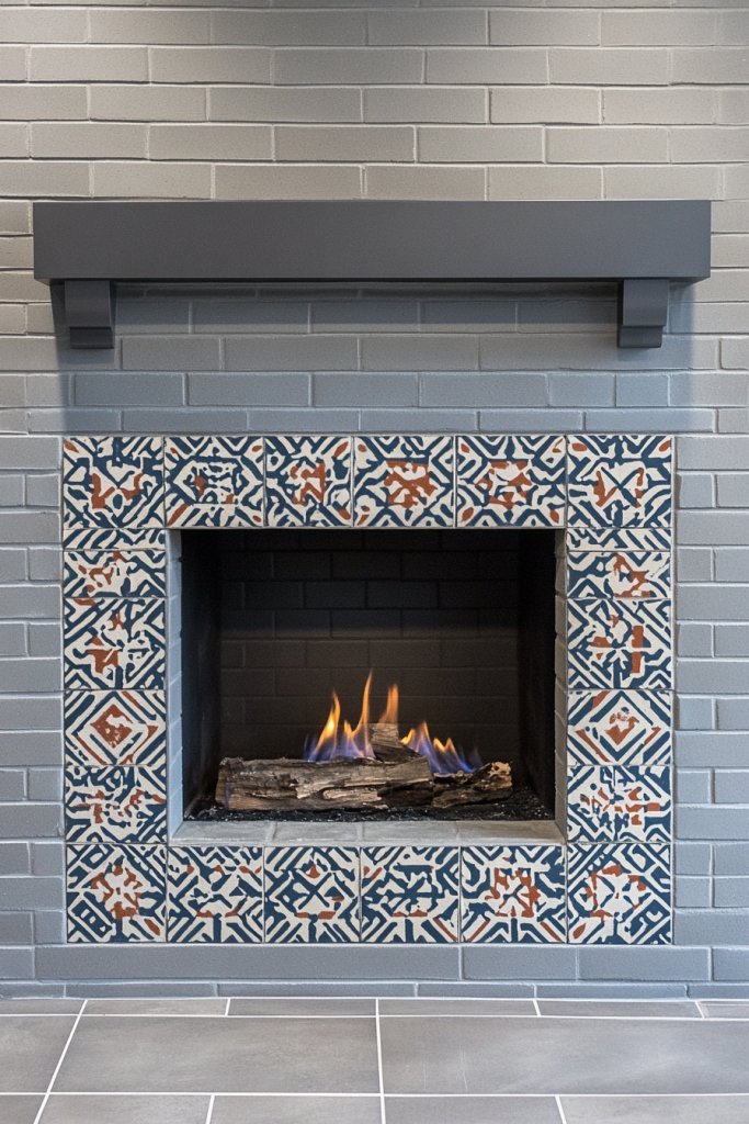 Looking to add a touch of pattern and visual interest to your fireplace? Geometric tile accents around a gray brick fireplace create a modern, eye-catching focal point. It’s a simple way to elevate your hearth from plain to wow without overhauling your entire decor.