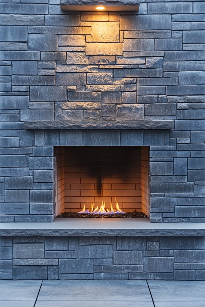 Picture a gray brick surround with recessed niches carved into the sides or above the fireplace opening. These niches can hold books, decor, or even subtle lighting fixtures. The textured bricks frame the niches, creating a layered, architectural look. Warm lighting inside the niches adds depth and highlights your favorite items.