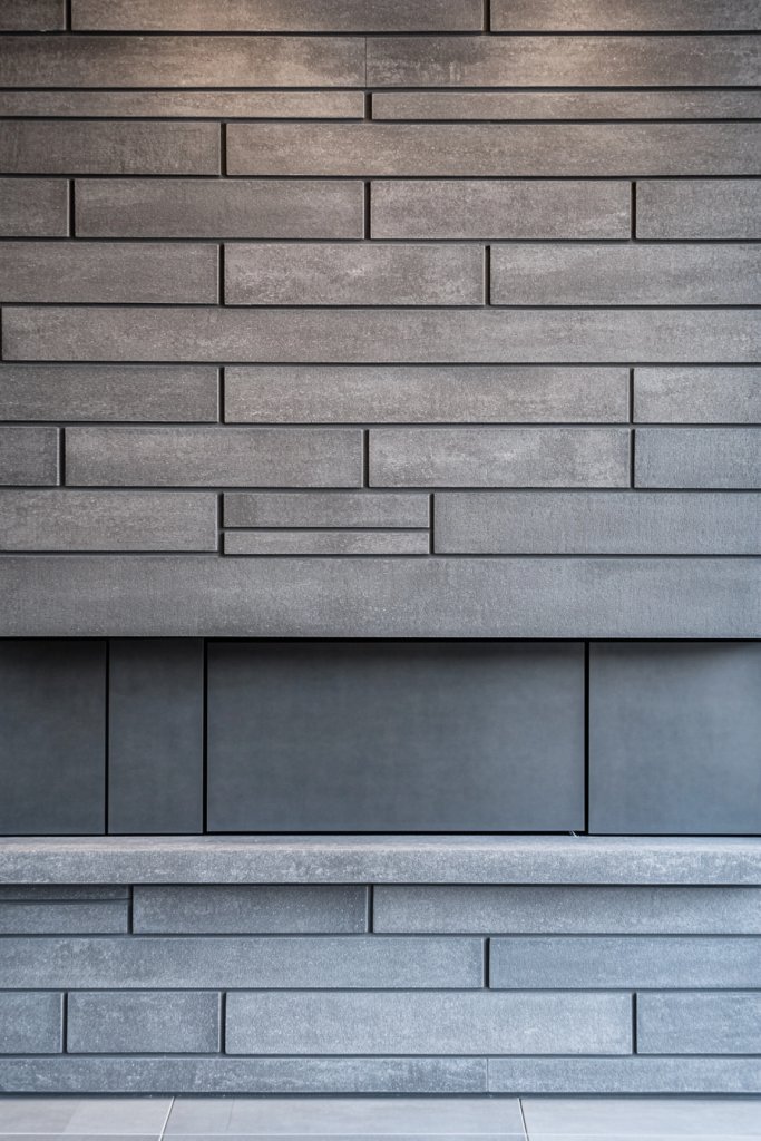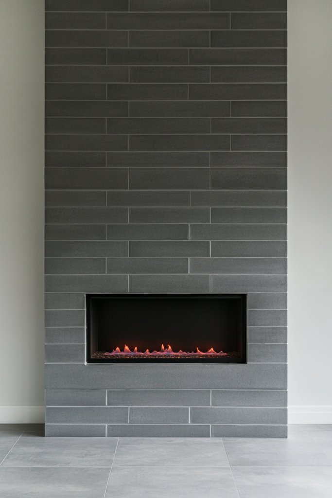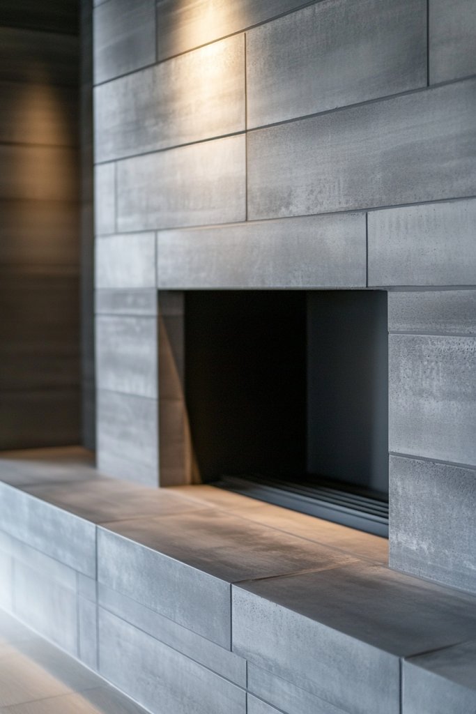 Imagine smooth, uniform gray bricks mimicking cast concrete, with subtle texture and matte finish. The fireplace blends into the wall like a sculptural element, with no fuss or frills. A slim, dark hearth anchors the design, and minimalist surrounds keep the focus on the clean, monolithic look. Soft lighting accentuates the sleek surface.