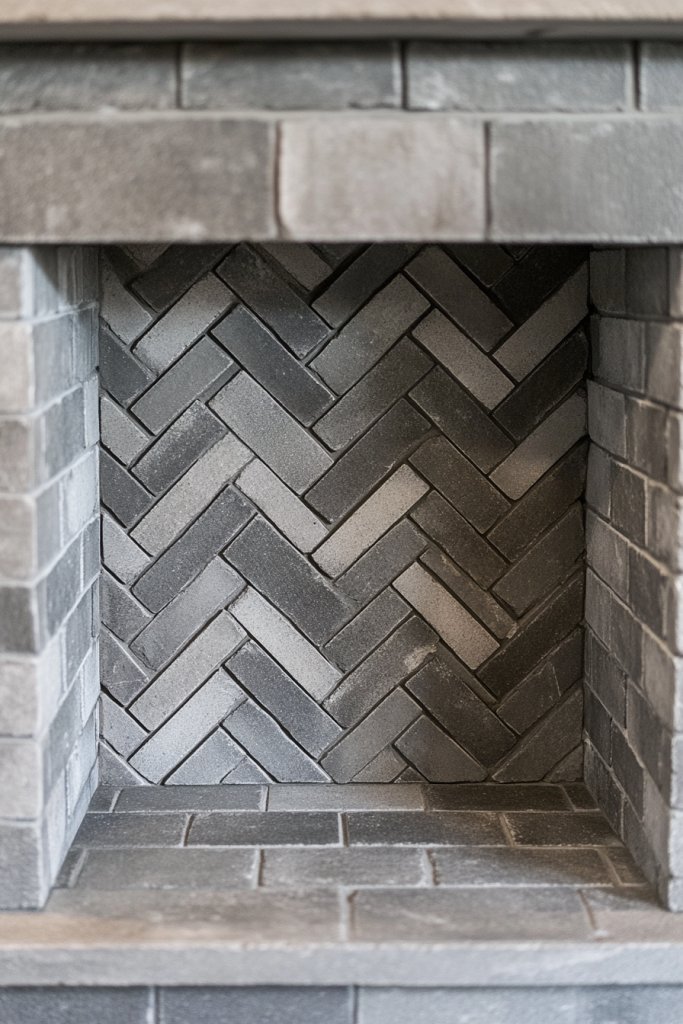 Picture gray bricks laid in a classic zigzag herringbone pattern, creating a dynamic visual flow. The angled joints catch light differently, emphasizing the pattern’s intricacy. A sleek, narrow hearth anchors the design, while a minimalist mantel or no mantel at all keeps the focus on the pattern. The textured surface adds depth and dimension.